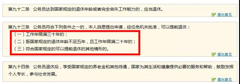 公务员法第九十三条明确规定:工作满三十年的,可以申请提前退休,而且最后也指明:符合国家规定的可以提前退休的其他情形也可申请提前退休,这种情况一般是指特殊岗位的公务员,由于其岗位特殊的工作条件,为保护其健康,国家允许其提前退休。